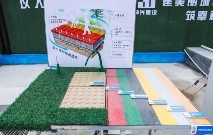 绿城九龙仓·杭州桂语朝阳园区步行道铺设了透水砖,雨水可以透过砖体渗入地下。在展示地面铺装结构时,通过立体图像,对每一层铺装材料进行形象说明。复杂抽象的材料和工法变得一目了然。