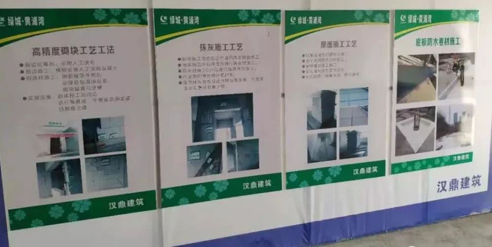 绿城黄浦湾还把抹灰、砌块等基础工艺的施工流程拍摄成照片,并制作成为展示板,粘贴在墙上。