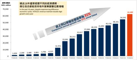 事实上,自2002年上市以来16年间,公司平均收入复合增长31%、盈利复合增长41%,2018年集团销售额突破625 亿。