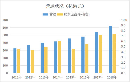 从整体来看,公司业务长年毛利率徘徊在3.8%至4.5%水平之间,但每年营收均达到稳定增长,从2011至2018年期,营收差不多翻倍,而股东应占净利也增长逾60%。