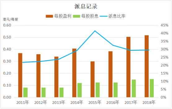 另外,公司长年维持稳定的现金分红,即使早年前利润下降,每股股息也没有因此而下调。