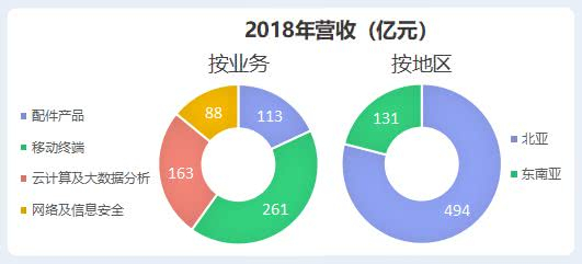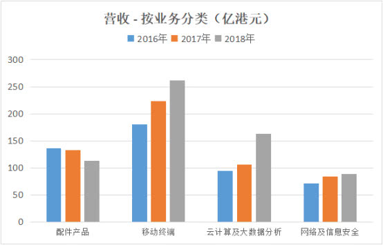 从业务分类来看,移动终端和云计算及大数据分析为近年增长最迅速的业务,于2018年同比增速分别达到16.8%和54.2%。