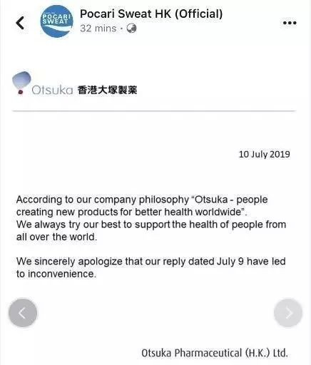 对此,宝矿力水特的日本总公司日本大冢制药株式会社(简称大冢制药)此前承认撤回TVB广告的决定是中国香港大冢制药公司所为,日本本部未给予任何指示,目前已知晓情况。7月11日,大冢制药在宝矿力水特中国香港分公司的官方社交账号上发布了一则声明。在说自己是支持全世界人们健康的公司后,只说了一句,“我们真诚地为我们7月9日做出的回应所带来的不便道歉。”