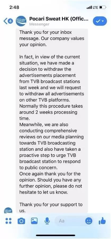 近日,能量性饮料宝矿力水特在回复推特网友的私信中称,鉴于当前形势,我们上周已经做出了从中国香港TVB撤回广告的决定。私信截图在网上流传,一时激起社会广泛讨论。