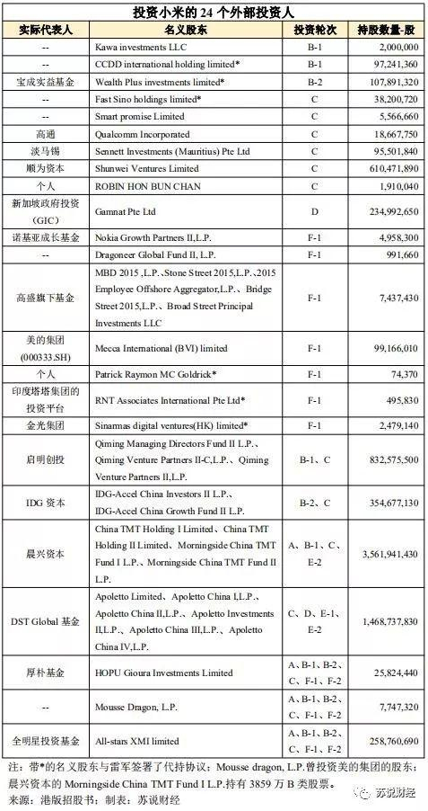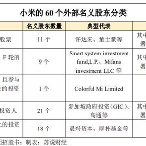 根据CDR版招股书,小米集团共有71个名义股东,其中11个代表了联合创始人。根据港股版招股书,小米集团共有69个名义股东,其中9个代表了联合创始人。也就是说,小米共有60个外部投资人。