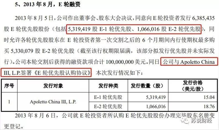 一是,E-2轮的投资成本比早先的C轮成本还便宜,仅为E-1轮价格的10%左右。这与E-1轮发行价格低于E-2轮发行价格不相符合。从结果看,持有E-2系列优先股的共有3个名义股东,分别是代表晨兴资本的Morningside China TMT fund Ⅱ L.P.,代表DST的Apoletto China Ⅲ,L.P.、Apoletto China Ⅳ,L.P.。但根据CDR版招股书,E轮只针对Apoletto China Ⅲ,L.P.发行了E-1和E-2系列股票,没有提及晨兴资本。