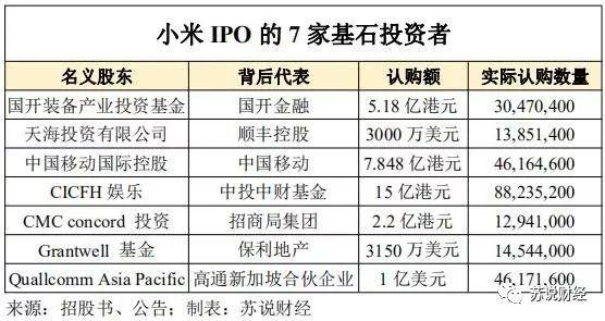 除了上市前投资的24个外部投资人,小米在招股书里还披露了IPO的7家基石投资者。基石投资者是港交所特有的制度,也是港股能否发行成功的关键因素,对发行价格也有影响,在首发上市后一般有6个月时间的锁定期。小米的7家基石投资者均承诺按发售价认购,累计认购股票数量达到2.52亿股。