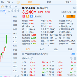 虽公告没有提及具体的盈利数据情况,但这不妨碍该消息引发了市场关注,今日早盘,超威动力的股价一度高开近7%,高见3.4港元,不过随后很快有所回落,截至收盘,小涨2.21%,报3.24港元,成交718.84万港元,目前市值35.77亿港元。