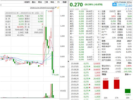 说到香港近期的仙股暴跌,不得不提及这几天的金汇教育。周四开盘四分钟,该股暴跌近80%,低见0.24港元,创近两年新低,昨日该股再跌20.59%,报0.270港元,总市值1.41亿港元,两天跌去了75%。