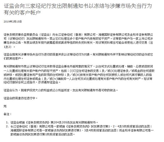 今年2月,香港证监会再次向金立丰等三家券商发出限制通知书,冻结涉嫌市场失当行为相关客户的账户,涉资逾38亿港元,金利丰证券旗下遭冻结的客户账户资产约10.91亿港元。据证监会调查,有上市公司涉嫌披露虚假或具误导性的财务资料,诱导投资者参与集资活动。