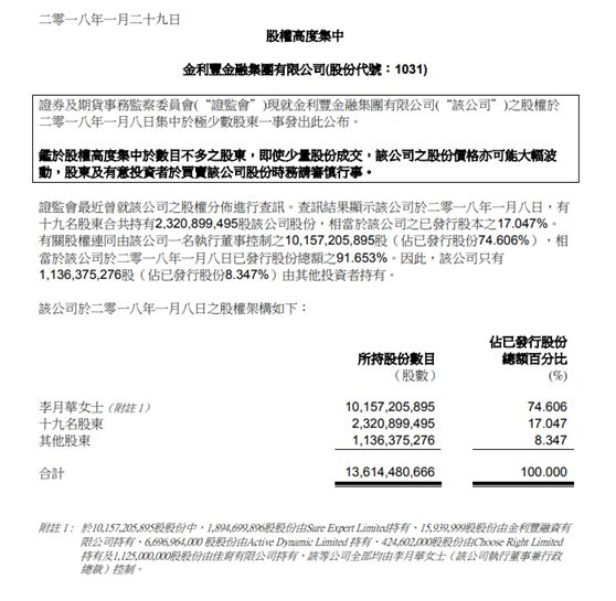 自2018年以来,金利丰已遭香港证监会多次“照顾”,2018年1月底,香港证监会第一次点名金利丰金融,称其股权高度集中,至此将金利丰股权问题摆到台面,大股东高度控盘,极易出现成交量小却暴涨暴跌的情形。查询结果显示,李月华个人持有金利丰股权高达74.606%,剩下19名股东持有17.047%股权,即前20大股东合计持股91.653%。