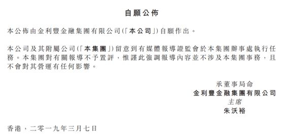 今年3月,金利丰再遭到香港证监会上门搜查,据悉搜查时间长达5小时,并带走大批文件,随后金利丰发布公告称,对于证监会于集团办事处执行任务一事不予置评,不会对公司营运造成任何影响。