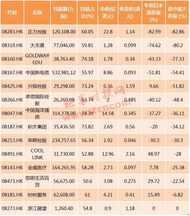 今年以来截至7月11日,金利丰持股比例在50%以上的14只个股中,有5只盘中最大跌幅超过50%。