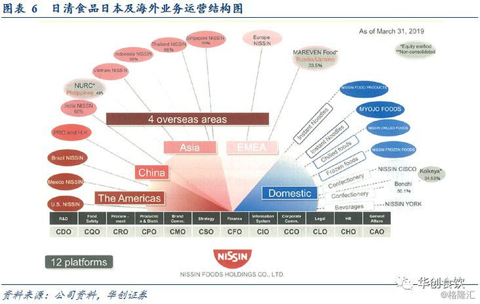 公司国内业务有7大运营公司,产品包括日清和MYOJO品牌方便面、冷冻及速冻食品、麦片及乳酸类饮料等,海外业务主要涵盖4大区域,分别是中国(包括中国香港)、亚洲(除中国外)、美洲及欧洲地区。公司2019财年国内业务收入3279亿日元,同增1.5%,收入比重为73%,其在日本方便面市场份额达52%,位居首位。海外市场方面,业务主要为即食型方便面,2019财年海外营收为1230亿日元,同增4.5%,收入比重为27%,当中美洲与中国地区营收占比分别为14.1%和9.2%,分列前二位。