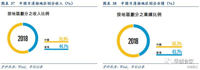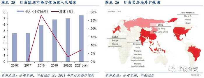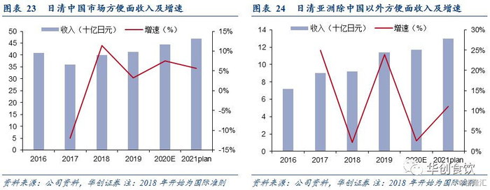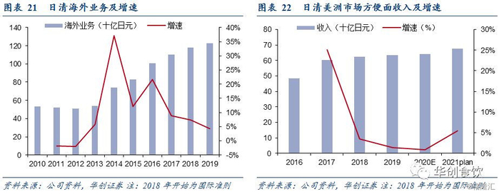 日清业务发展:国内多措并举力争稳定增长,海外市场发展聚焦杯面和目标国家。日清在日本国内方便面份额超50%,品牌认知度高居前三,未来国内市场增长来自于目标群体扩大及细分产品创新,继续聚焦现有核心人群(20-44岁男性)之外,将老年人、女性及年轻人纳入目标消费群体,针对不同人群推出细分化产品。此外,也积极发展方便面之外的第二板块业务,糕点麦片业务重塑品牌扩大业务规模,冷冻速冻食品板块聚焦高附加值产品等。海外扩张方面,日清2013年后海外业务收入增长加快,2019财年亚洲(除中国)及欧洲增速领先,美洲和中国增长在低个位数水平。海外市场一方面聚焦高附加值杯面提升盈利水平,目标2021年海外杯面销量同比2016年增长50%,一方面目标市场聚焦金砖国家,目标2021年金砖四国收入占海外收入70%。对于中国市场,在香港地区主打业务多元化,在大陆市场实施产品高端化、杯面品牌持续宣传、渠道网络扩张及业务多元化等举措,2018年日清中国收入26.3亿元,净利润1.8亿元,净利率7.7%。