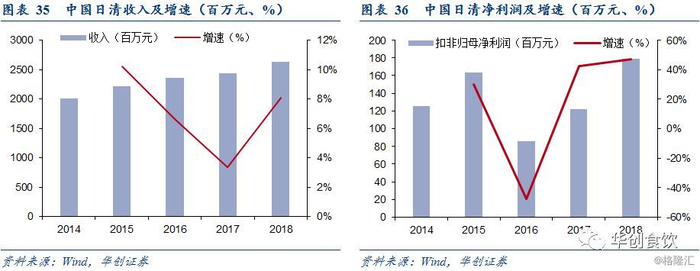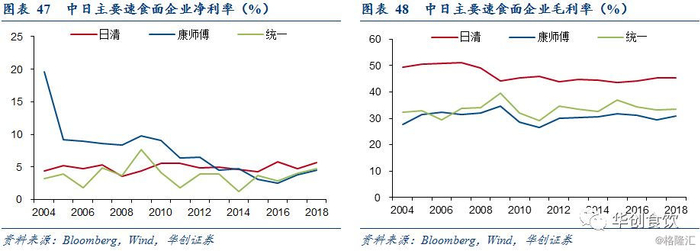 3)关于企业,坚持产品创新、差异化竞争是成功的关键。从日清的发展历程来看,首先,在日本市场,日清市场份额高居首位,其经营利润率也远高于竞争对手,定价高于竞争对手的核心因素在于强品牌力、持续的产品创新以及产品差异化高端化的定位策略,如Toyo Suisan则以低端产品为主。此外,日清在成熟的日本市场每年仍有300-400个SKU推出,持续推出新产品新口味,广告宣传上持续与消费者互动,如Cup noodles这类明星产品也在不断更新,使得日本市场保持持续领先地位。其次,在海外扩张当中,以中国市场发展为例,定价上坚持略高于同类产品,保持高端产品定位,产品生产重视食品安全卫生,同时采取差异化竞争策略,日清在中国市场自始至终在高端杯面市场进行竞争,中低端市场基本以康师傅和统一为主。