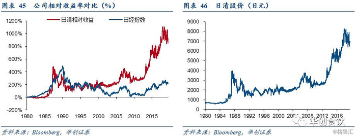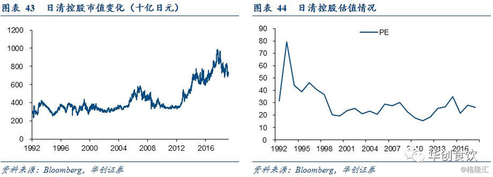 公司市值稳步成长,估值中枢在25-30倍。公司市值方面,公司市值从1992年的3068亿日元增长至2019年的7410亿日元,增幅达141.5%;估值方面,1992年至今估值中枢在29倍左右,近几年估值中枢在25-30倍之间;相对收益率方面,自2000年以来,日清股价涨幅显著跑赢日经指数。