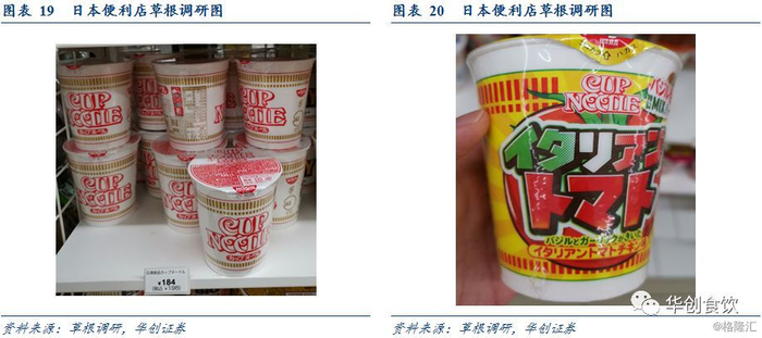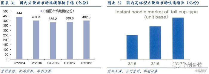 2)关于产品,方便面有结构提升空间,更有细分化趋势。以日本方便面市场发展为例,日清作为行业龙头,针对不同的目标消费人群,推出对应产品以满足细分需求,针对女性重视健康推出低卡路里高纤维产品,针对老年群体推出量小具备特色的日本荞麦面,针对年轻群体喜欢的口味推出如冬阴功汤、兰州牛肉面口味产品,针对高收入群体推出鱼翅高营养产品等。因此对于企业,在满足细分消费者需求的同时,也是业绩增长点的来源。又以全球方便面结构为例,包括中国在内的一些亚洲国家杯面占比仍低于或接近全球平均水平,说明未来方便面仍有一定结构提升空间,过去行业发展当中企业竞争激烈,价格亲民化,但未来随着杯面产品更受欢迎,结构提升将带来龙头企业方便面业务发展的改善。