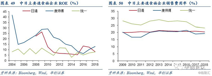 我们简要对比日清与中国龙头企业康师傅与统一。1)毛利率:由于康师傅统一未披露单独方便面业务毛利率,从整体毛利率对比上看,日清毛利率在45%左右,康师傅统一平均在30%-35%左右,日清高于国内龙头企业。2)净利率:日清2018财年净利率为5.6%,高于康师傅与统一,表明产品高端化定位和差异化竞争带来更好的盈利水平。3)ROE:日清ROE从2016年以来有所下降,2018财年为8%,康师傅ROE为13%,统一为8%。