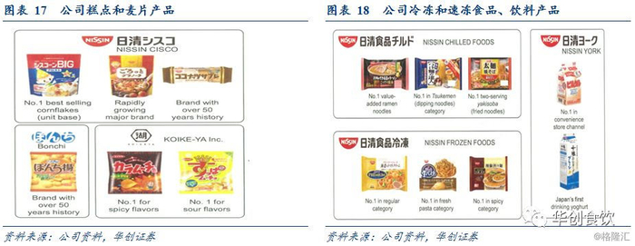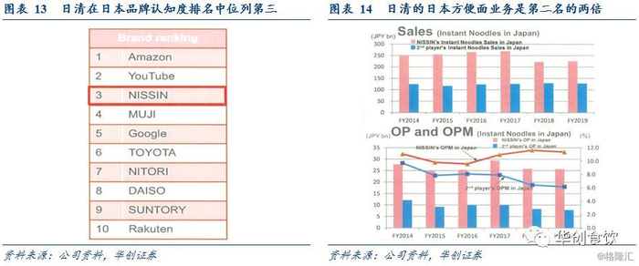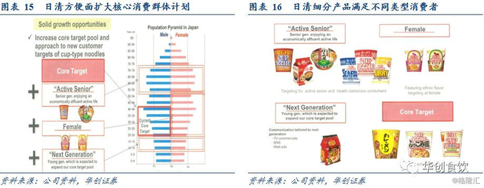 市场扩容与产品差异化持续发力,力争方便面业务稳健增长。调研数据显示,日清在日本国内方便面业务稳居龙头地位,市占率超50%,并且方便面业务收入、营业利润等财务指标均显著优于第二名。日清作为方便面品牌,在Brand Japan举办的日本品牌认知度排名中,位列第三,仅次于Amazon和YouTube。为了继续在国内市场寻求增长机会,日清的增长战略包括市场扩容与细分产品两部分。在市场扩容方面,除继续聚焦现有核心目标群体(20-44岁男性)以外,公司计划将老年人(55-74岁) 、女性(20-54岁)以及年轻人(10-19岁)纳入到目标消费人群;在细分产品方面,针对不同目标群体推出不同的产品,同时通过电视网络广告以及社交网络平台对下一代年轻人进行宣传引导。