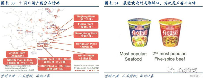 从市场环境来看,2018年中国方便面市场总需求量403亿份(全球第1位),其中高杯型方便面2015-2017年规模增长达70%。公司经营策略上,在中国香港主打业务多元化,包括方便面、速冻食品、薯片及果汁生产等;在中国大陆,实施措施包括产品高端化、杯面品牌持续渗透、销售和配送网络的扩张、业务多元化以及质量控制。日清中国业务已于2017年在港交所上市,有利于中国业务融资用于产能扩张。产能方面,公司在浙江、广东、福建、香港等地建有9座工厂。