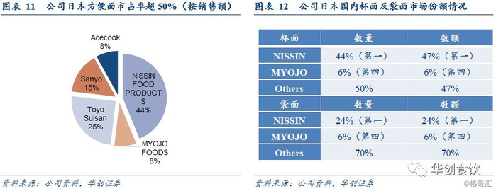 日清在亚洲及美洲多国份额领先,中国市场高端化定位。根据调研数据反馈,日清在日本国内、中国香港、美国、墨西哥、巴西等多国实现市占率领先。在日本当地市场,公司2018财年方便面市占率为51.5%,其主要竞争对手Toyo Suisan、Sanyo和Acecook市占率分别为24.8%、15.0%和8.0%。分品类来看,杯面市场2019财年日清市占率超过50%,袋面市场市占率为30%左右。在中国市场,公司深耕香港及大陆多年,在香港市场份额排名第一,在大陆市场由于产品实施杯面差异化竞争策略,整体份额不及统一及康师傅等,但在高端市场上份额排名首位。