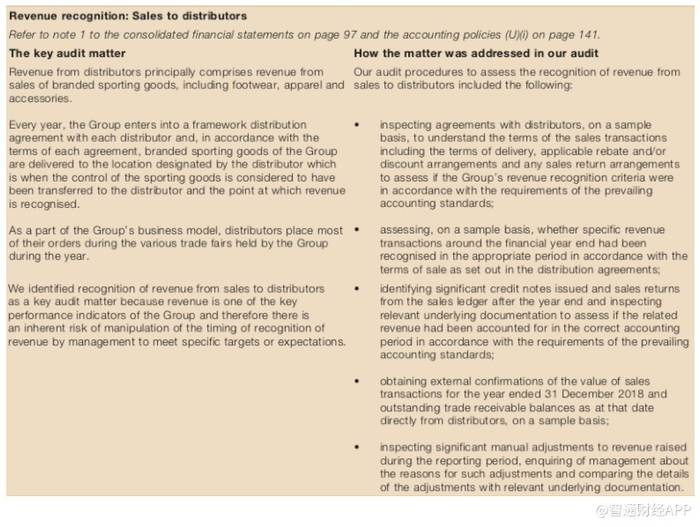 下面是安踏2018年年报的内容。安踏列出了审计人员审核分销商收入确认的方法:a)评估分销商协议(由安踏提供),b)评估安踏的账户是否以经销商协议提供的方式反映收入(安踏提供的信息),c)审查信贷票据和退货的文件(由安踏提供),d)发送确认信到分销商(其金融部门安踏控制)和e)向管理层询问(欺诈的策划者)重大销售调整。
