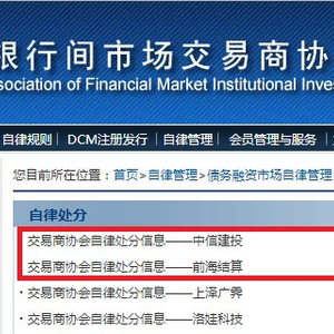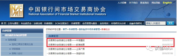 7月17日,交易商协会公告了2条自律处分, 中信建投 证券、前海结算商业保理因在五矿地产ABN相关产品上存在未备案即发行、披露财报信息不准确等问题被给予通报批评,并做出相关的处罚和整改要求。