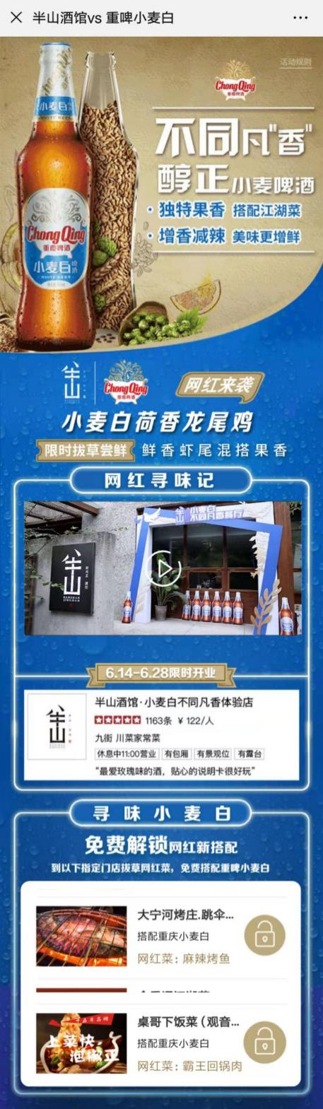 线上,用户通过“不同凡香餐厅”活动H5解锁套餐,可参与指定餐厅消费店内网红菜,免费领取小麦白啤酒的专享福利,引导用户拔草三城餐厅寻味菜品,驱动小麦白线下核销。
