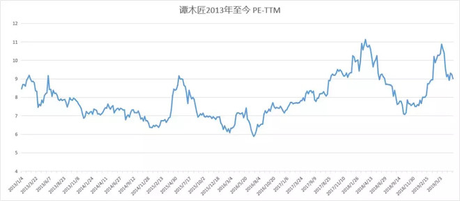 谭木匠2013-2017年之间市盈率长期处于6倍-9倍之间波动,我们也知道此段时间谭木匠的净利润是窄幅震荡的,所以这个估值也符合公司的发展阶段。2017年报后公司派发特别股息,使得公司的估值有了提升的动力,开始脱离波动了四年的估值区间。2018年熊市期间,公司的跌幅也有限,随着市场企稳和公司第二次派发特别股息,公司在五月初再创新高。