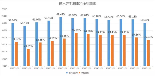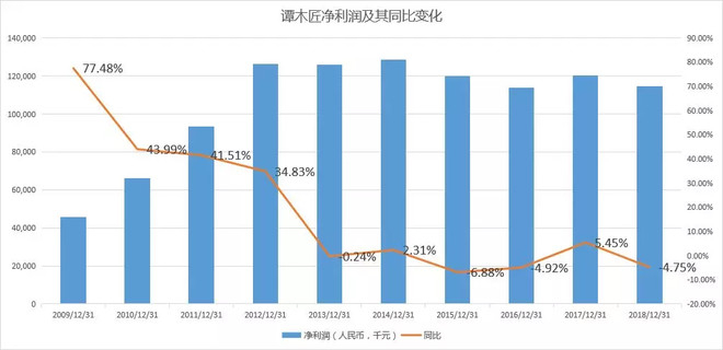 2018年营收增速很低,则一定程度上与2013、2014年营收增速很低的原因类似,那便是非必需品消费在经济形势变差的时候消费会减少。2013年开始,宏观经济恶化,当时工业、房地产、投资持续调整,所以购买力也下降严重。2018年刚刚过去,我们也了解去年各行各业对经济形势的担忧,虽然没有2013、2014年严重,但也笼罩着强烈的悲观气氛。谭木匠因其定位较为高端、消费单价较高,且属于非必需品消费,所以在经济不好的时候出现营收下滑是比较正常的。