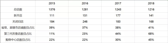 2013年到2018年期间,公司的另一项政策也造成了营收的增长乏力,那便是对店铺的调整。公司在2014年,拥有高达1452间店铺,而2018年末,公司仅拥有1216间店铺。