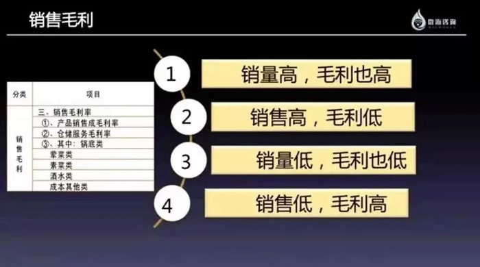看销售毛利时主要关注锅底、荤菜、素菜及酒水,将其分为销量高,毛利也高;销售高,毛利低;销量低,毛利也低;销售低,毛利高这四种类别,对症下药,该提价提价,该降价降价,该淘汰淘汰。