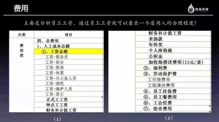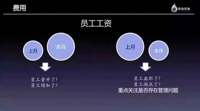 看费用时主要是分析员工工资、物料费用和营业外支出,通过工资的变动了解门店的用工、人员流动及成长情况,通过物料费用掌握物料的消耗情况,通过营业外支出了解门店突发事件。