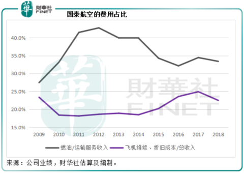 飞机维修及折旧开支涉及的是我们上文提到的资本开支,若购置或租赁飞机能够实现协同效应,折旧开支得到有效管理应该是最直接的效果。从上图可以看到,在2016年至2018年期间,此比例处于较高的水平,未来看看国泰航空能否将这一比例下调。