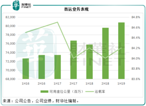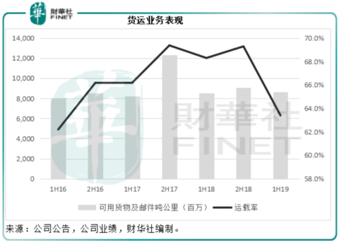 2019年上半年,国泰航空的可用座位公里较上年同期增加了6.66%%,乘客运载率与2018年上半年持平,为84.2%。可用货物及邮件吨公里较上年同期增加1.09%,货物及邮件运载率同比下降了4.9个百分点,至63.4%。