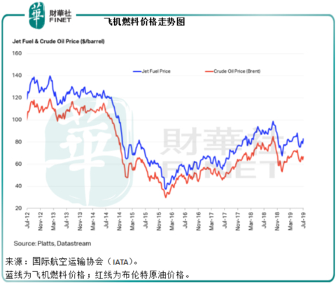 首先,燃料开支与燃料价格息息相关,从下图可以看到,国泰航空的燃油占比与国际航空运输协会的飞机燃料价格走势图一致,在飞机燃料价格上涨时,燃油占收入的比重上升,反之亦然。