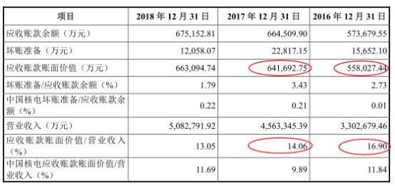 2018年6月19日报送的招股书显示,中广核电力2016年、2017年应收账款账面价值分别为57.25亿元、66.10亿元,占营业收入比例分别为17.33%、14.48%。