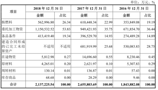中广核电力存货主要包括委托加工物资、建造合同形成的已完工未结算资产、核燃料及备品备件等。