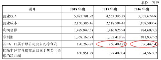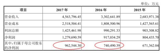 中广核电力2018年6月19日报送的招股书显示,2016年、2017年归属于母公司股东的净利润分别为74.05亿元、96.25亿元。