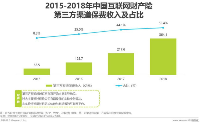 互联网保险销售渠道主要分为官方自营渠道和第三方渠道。从渠道侧市场份额来看,第三方渠道占据互联网保险的主要保费收入来源。得益于互联网保险产品结构的不断优化,在互联网保险整体保费增长疲软的背景下,通过第三方渠道的产生的保费在互联网财产险领域依然保持快速增长。而互联网人身险领域中第三方渠道占比虽然有所下降,但依然占绝对主导地位。相比于官方自营渠道,第三方网络平台拥有更多的用户场景,而专业保险中介能够为用户提供高质量的服务,两者都不仅仅是销售方式的转变,而是赋予了更多互联网保险的核心意义。