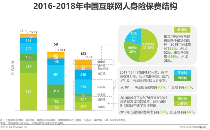 概览:受保险行业结构转型时期影响,互联网保险整体发展受阻,2018年行业保费收入为1889亿元,较去年基本持平,不同险种发展呈现分化格局,其中健康险增长迅猛,2018年同比增长108%,主要由短期医疗险驱动。