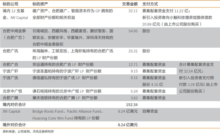 1)以现金方式支付88.93亿元,包括以募集配套资金向境内外GP支付0.07亿元、以募集配套资金向境内LP支付32.54亿元、向境外LP支付8.235亿美元(约折合56.32亿元人民币);