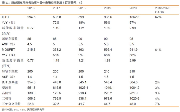 从单车的价值量推导新能源汽车带来的功率半导体器件的市场增量,我们做出如下判断,新能源汽车每卖出50万辆,对于功率半导体器件的市场增量为1.5亿美元。