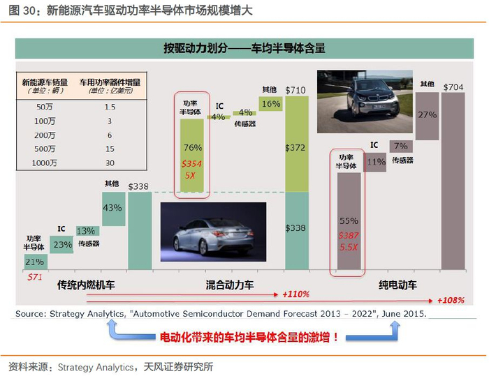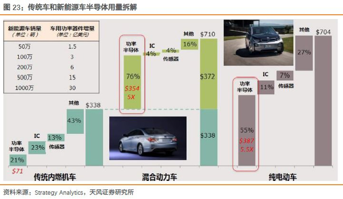 对传统车和新能源车进行半导体用量拆解,功率半导体增量最为显著。据Strategy Analytics,传统燃油车功率半导体用量约占其汽车半导体总量的21%,成本71美元左右;混合动力车功率半导体成本攀升至354美元,纯电动汽车则可达到387美元,分别是传统燃油车的5倍和5.5倍。作为比较,IC和传感器在混动车和纯电动车上的价值增量分别为1.2/1.0和1.3/1.1倍,低于功率半导体。