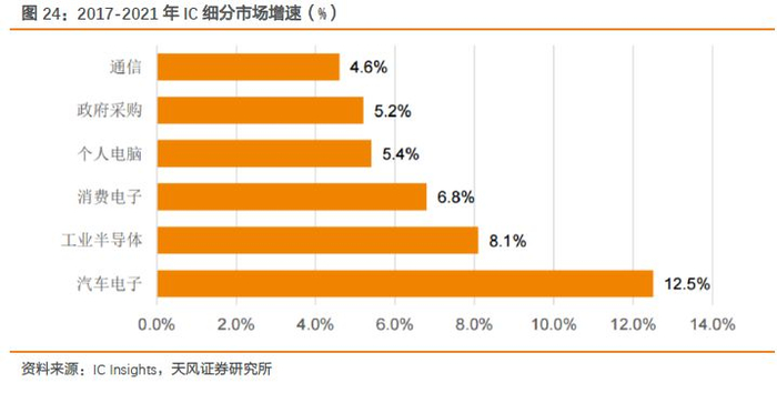 IC Insights在2018年公布的汽车IC市场预测显示,到2021年,汽车IC市场将会增长到436亿美元,2017年到2021年之间的复合成长率(CAGR)为12.5%,大大高于2016年预测的5.4%复合成长率,在IC细分市场中增长率最高,工业半导体以8.1%增速位列第二。