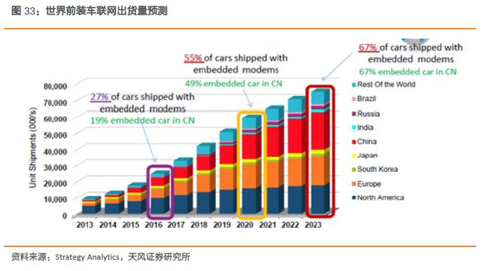 新能源车普及、5G唤醒车联网生态,带动车用半导体的单车价值量倍增,未来汽车是核心。新能源车增量一方面来源于公司原有客户,另一方面来源于国内新能源汽车的快速增长。对于安世半导体而言新能源车带来的汽车半导体增量重点在车用MOSFET部分,我们测算2020年全球售出新车搭载的MOSFET规模将达9.41亿美元。2020年全球前装车联网渗透率将达55%,2023年将达67%,公司在T-BOX 车机系统、嵌入式智能电动汽车计算单元深入布局,客户包括东风、开瑞、比亚迪等传统车厂及百度、车和家等互联网汽车新势力。