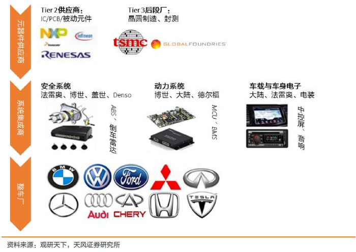 汽车零部件产业链分工高度专业化,供应商资格认证周期长,供货稳定。产业链主要由电子元器件供应商(Tier 2&3)、系统集成商(Tier 1)以及下游整车厂商构成。其中,Tier 1历史上源于几大整车厂的零部件业务分拆,在业务上拥有极强的主导权,掌握着上游零组件的采购与定价。目前Tier 1市场基本被博世、大陆、电装等寡头垄断,全球前10的市场占有率达到了70%。