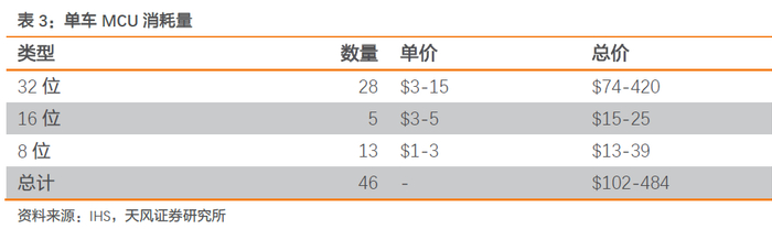 2.2.1. 整车控制系统(VCU)整车控制系统是实现整车控制决策的核心电子控制单元,一般仅新能源汽车配备、传统燃油车无需该装置。VCU通过采集油门踏板、挡位、刹车踏板等信号来判断驾驶员的驾驶意图;通过监测车辆状态(车速、温度等)信息,由VCU判断处理后,向动力系统、动力电池系统发送车辆的运行状态控制指令,同时控制车载附件电力系统的工作模式;VCU具有整车系统故障诊断保护与存储功能。2.2.2. 电机控制器(MCU)电机控制器(MCU)通过接收VCU的车辆行驶控制指令,控制电动机输出指定的扭矩和转速,驱动车辆行驶。实现把动力电池的直流电能转换为所需的高压交流电、并驱动电机本体输出机械能。车用MCU在汽车中的应用呈现出多样性,从简单的车灯控制到复杂的发动机控制、汽车远程通信实现,高、中、低端MCU在汽车中都可以发挥作用。不同汽车电子系统对MCU的要求是不同的,也就决定了车用MCU的多样性。一辆汽车至多需要50颗MCU,应用领域遍及安全应用、车体控制、动力能源相关等,其中电动汽车分别在EV主反相器、EV辅助反相器、EV HV/LV DC/DC、EV AC/DC充电部件比传统汽车多需要4颗MCU,其中32位MCU单价在3-15美元,16位MCU单价在3-5美元,8位单价在1-3美元。总体而言,单车MCU价值在102-484美元。