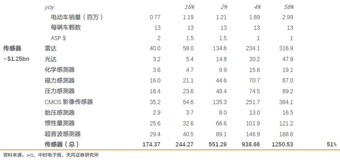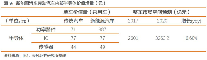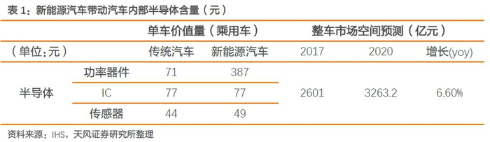 我们假设2016-2020年全球燃油车年产量由6963万辆增长至7478万辆,年均增速2%;新能源汽车(包括纯电动和混动)由77万辆增长至299万辆,计算年均增速为47%,考虑内部零部件电子化带来的价值增量,我们判断车用半导体增速远快于2%的汽车市场平均增速(见下表)。我们认为汽车新能源化带来的价值和量同步升级,汽车半导体企业将深度受益于相关产业扩张所带来的市场机遇。